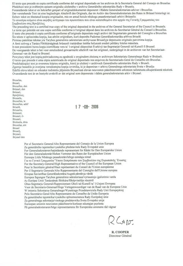 parakstīts 2006. gada 17. jūlijā ES Vispārējo lietu un ārējo attiecību