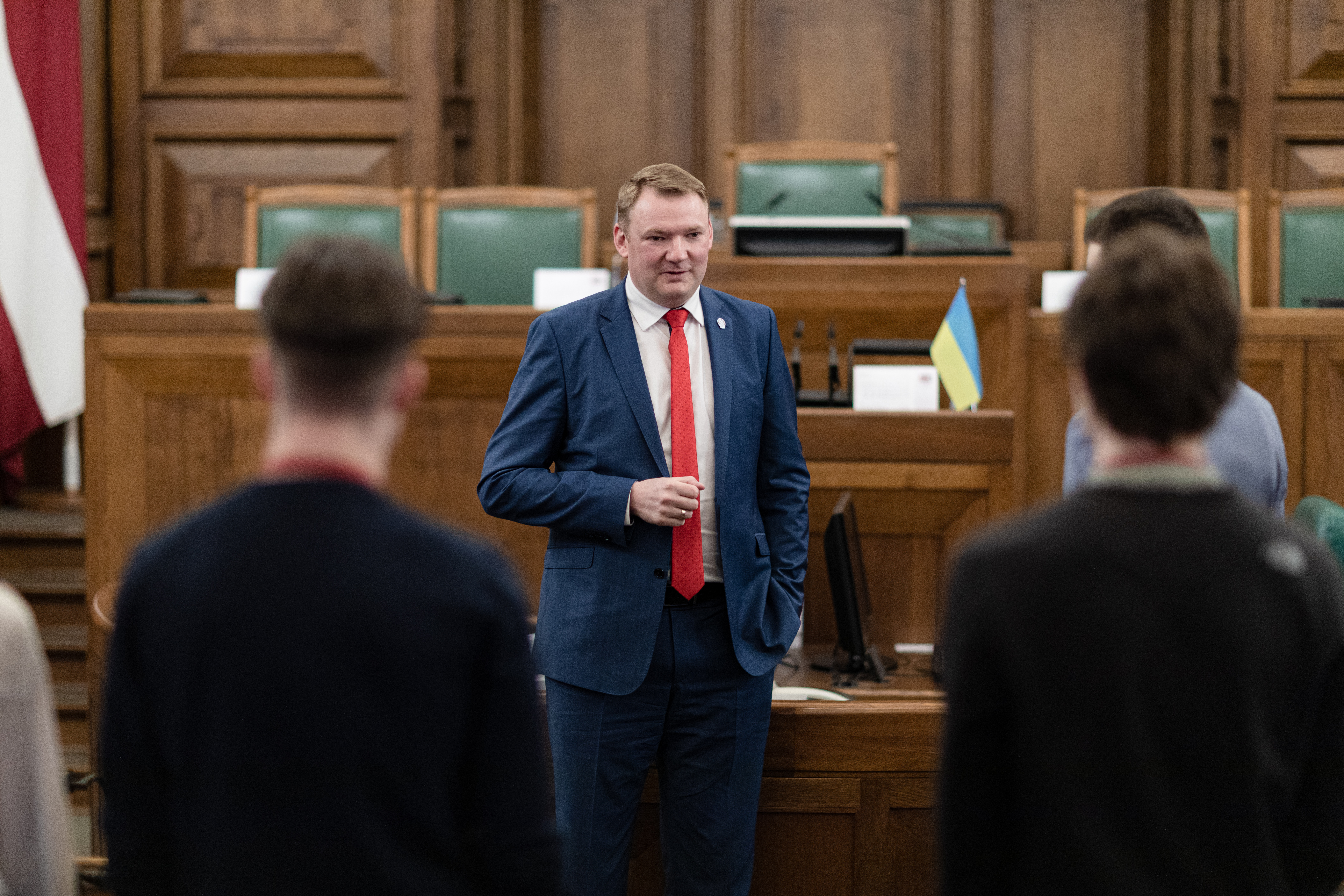 2023.gada 2.maijs. Saeimas priekšsēdētājs Edvards Smiltēns tiekas ar Rīgas 64.vidusskolas skolēniem. Foto: Reinis Inkēns, Saeima Izmantošanas noteikumi: saeima.lv/lv/autortiesibas