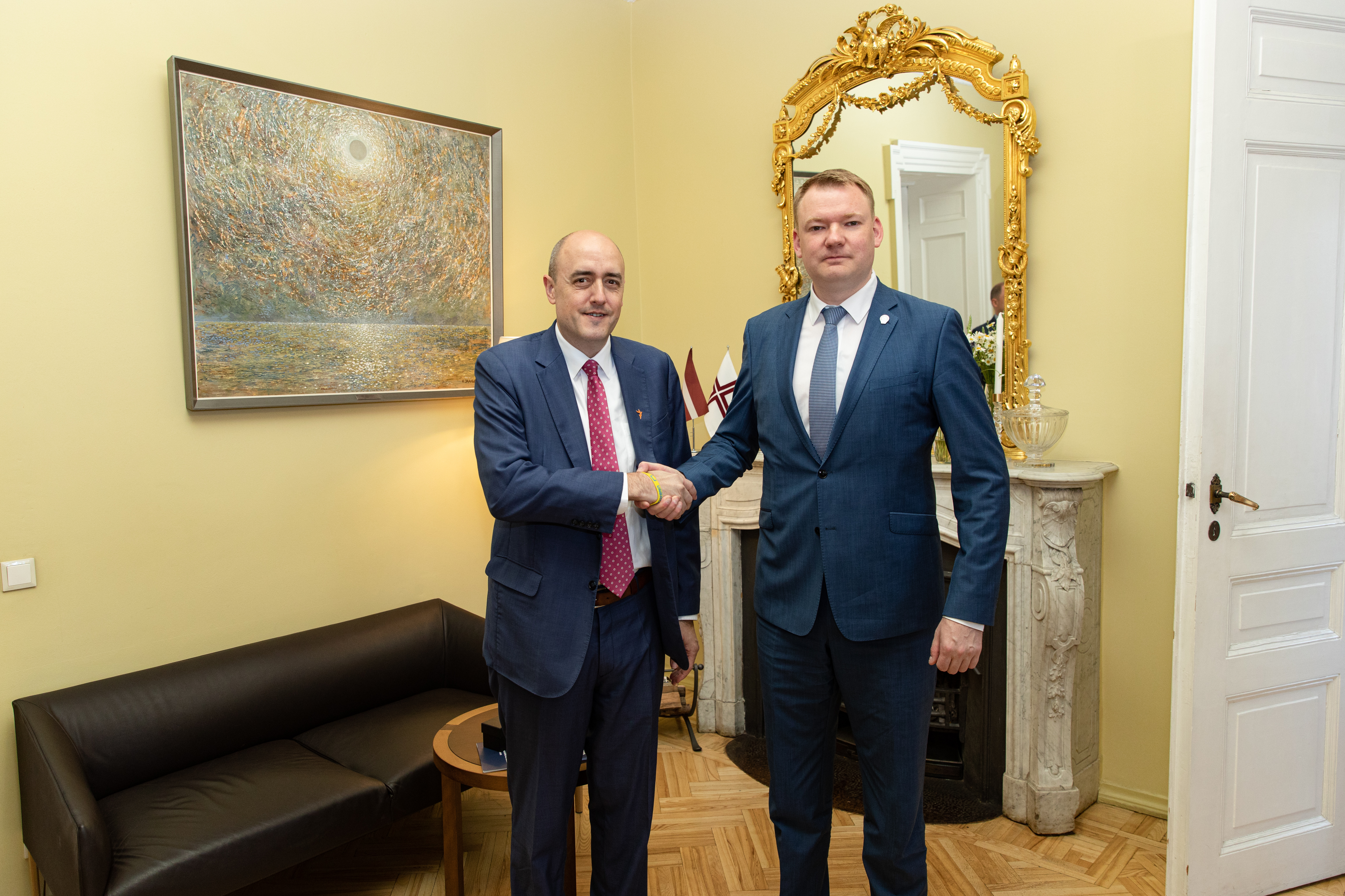2023.gada 13.jūnijs. Saeimas priekšsēdētājs Edvards Smiltēns tiekas ar Radio Brīvā Eiropa izpilddirektoru Džeimiju Flaju (Jamie Fly). Foto: Reinis Inkēns, Saeima Izmantošanas noteikumi: saeima.lv/lv/autortiesibas