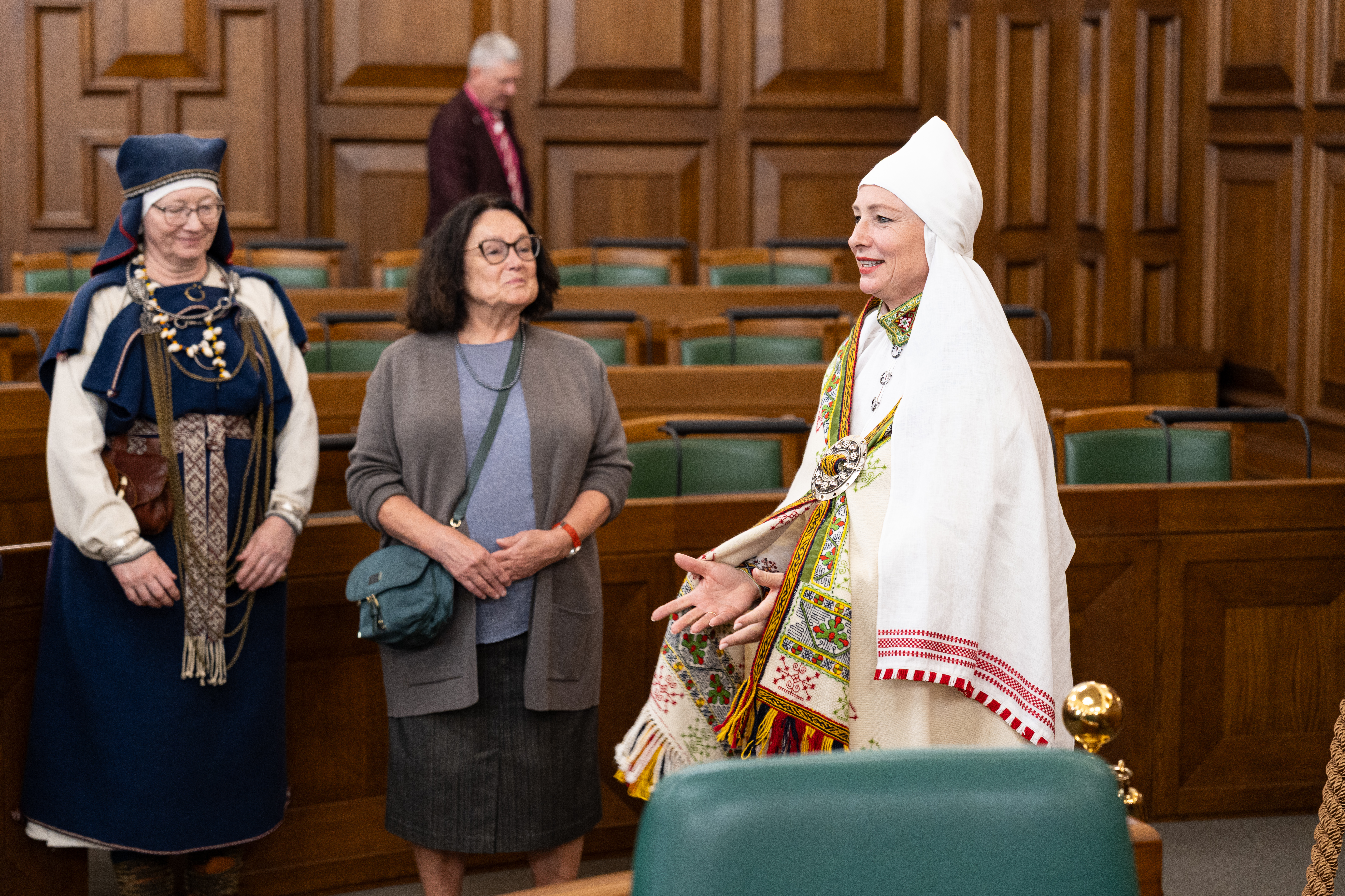 2025.gada 9.jūlijs. Saeimas priekšsēdētāja Daiga Mieriņa tiekas ar tautastērpu meistariem. Foto: Reinis Inkēns, Saeima Izmantošanas noteikumi: saeima.lv/lv/autortiesibas