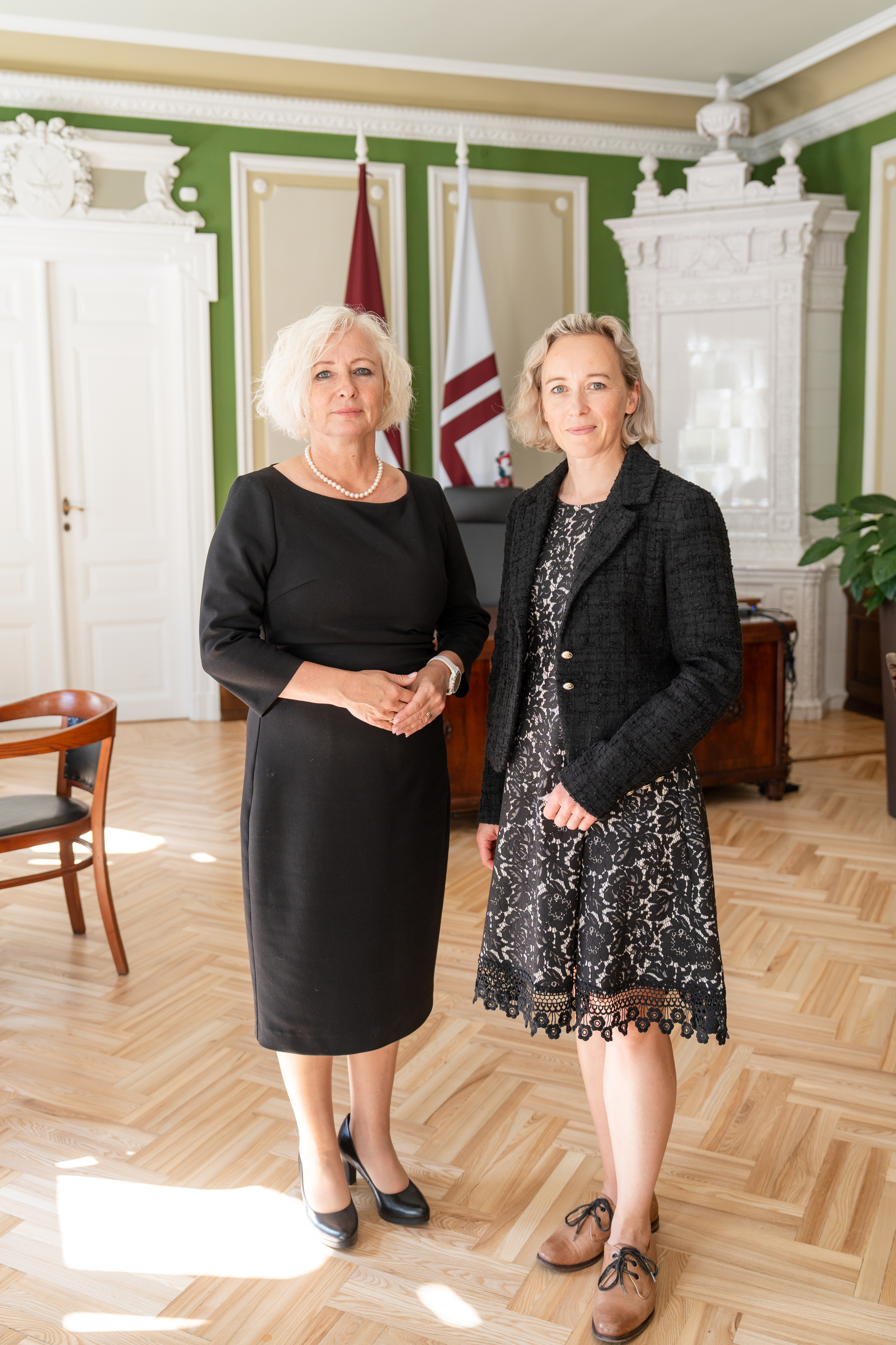 2025.gada 2.septembris. Saeimas priekšsēdētāja Daiga Mieriņa tiekas ar Sabiedrisko pakalpojumu regulēšanas komisijas padomes priekšsēdētāju Aldu Ozolu. Foto: Ieva Ābele, Saeima Izmantošanas noteikumi: saeima.lv/lv/autortiesibas