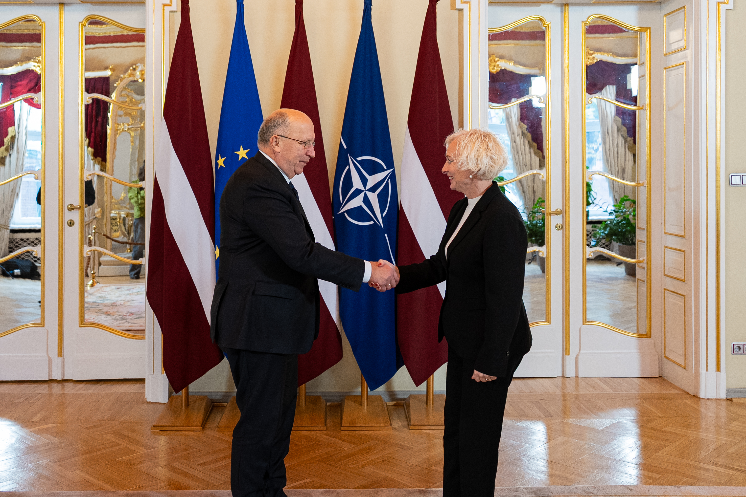 2025.gada 9.oktobris. Saeimas priekšsēdētāja Daiga Mieriņa tiekas ar Eiropas Komisijas Aizsardzības un kosmosa komisāru Andrjus Kubiļus (Andrius Kubilius). Foto: Juris Vīgulis, Saeima Izmantošanas noteikumi: saeima.lv/lv/autortiesibas