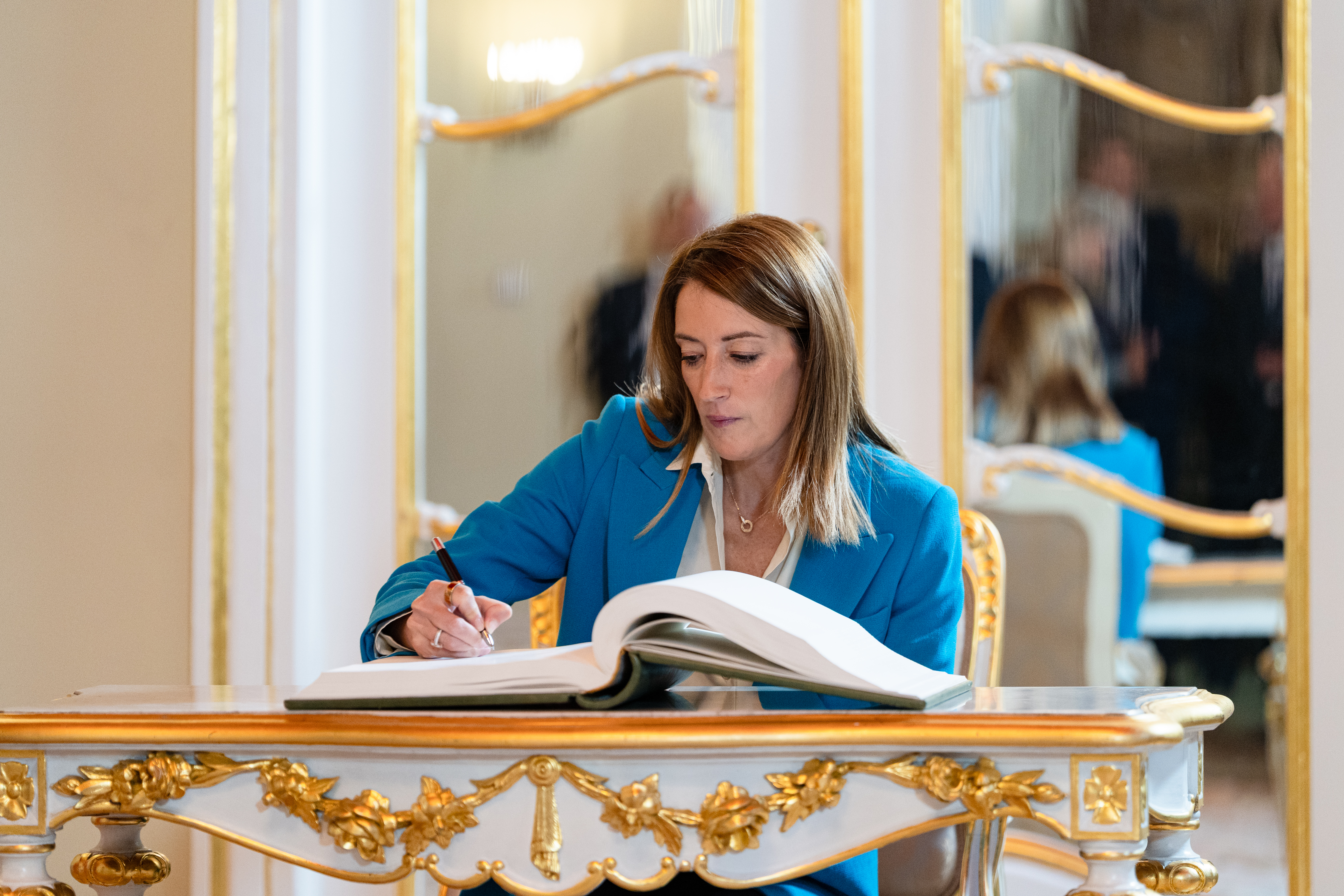2025.gada 10.oktobris. Saeimas priekšsēdētāja Daiga Mieriņa tiekas ar Eiropas Parlamenta priekšsēdētāju Robertu Metsolu (Roberta Metsola). Foto: Reinis Inkēns, Saeima Izmantošanas noteikumi: saeima.lv/lv/autortiesibas
