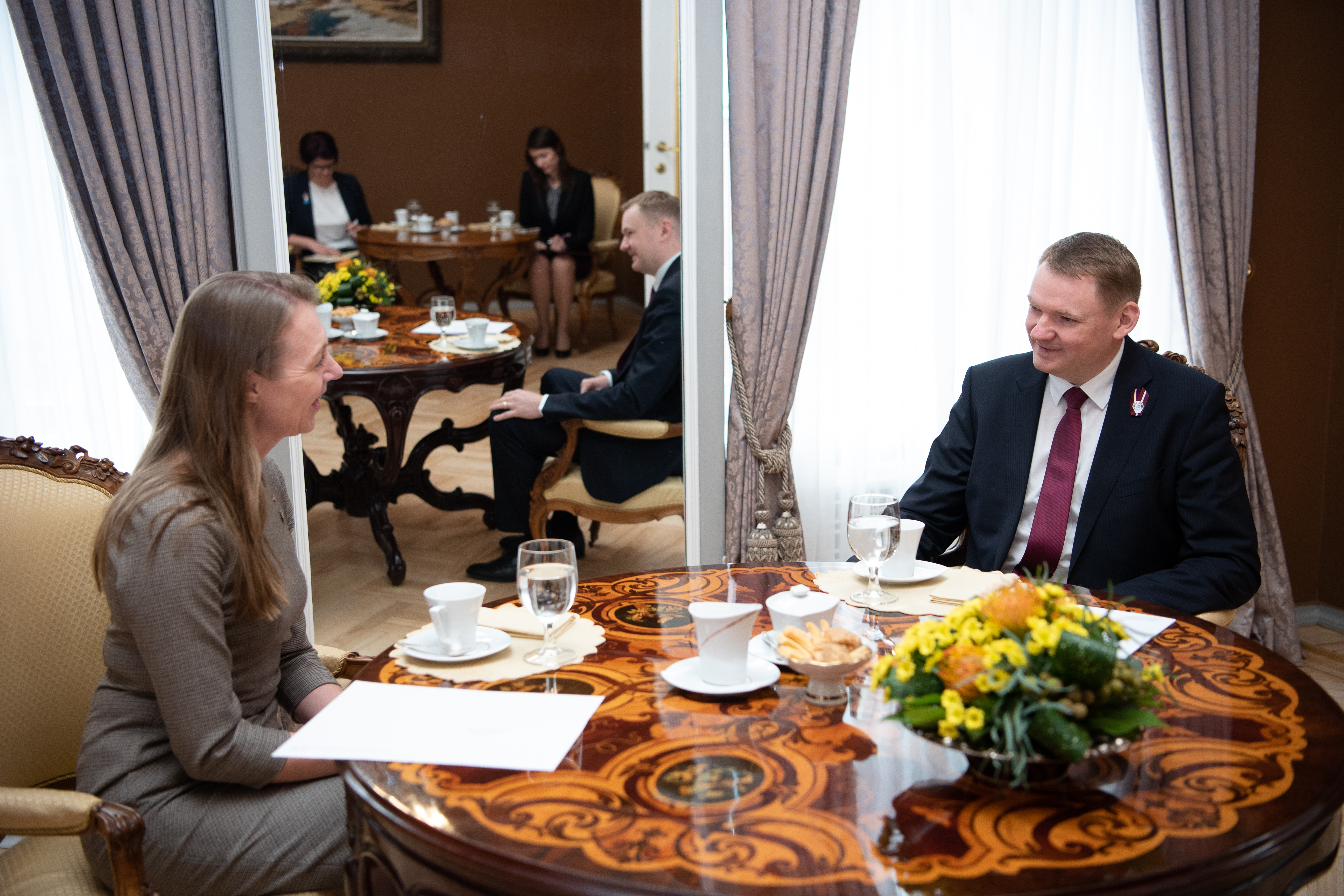 2022.gada 16.novembris. Saeimas priekšsēdētājs Edvards Smiltēns tiekas ar Norvēģijas Karalistes ārkārtējo un pilnvaroto vēstnieci Latvijas Republikā Īni Morengu (Ine Måreng). Foto: Ieva Ābele, Saeima Izmantošanas noteikumi: saeima.lv/lv/autortiesibas