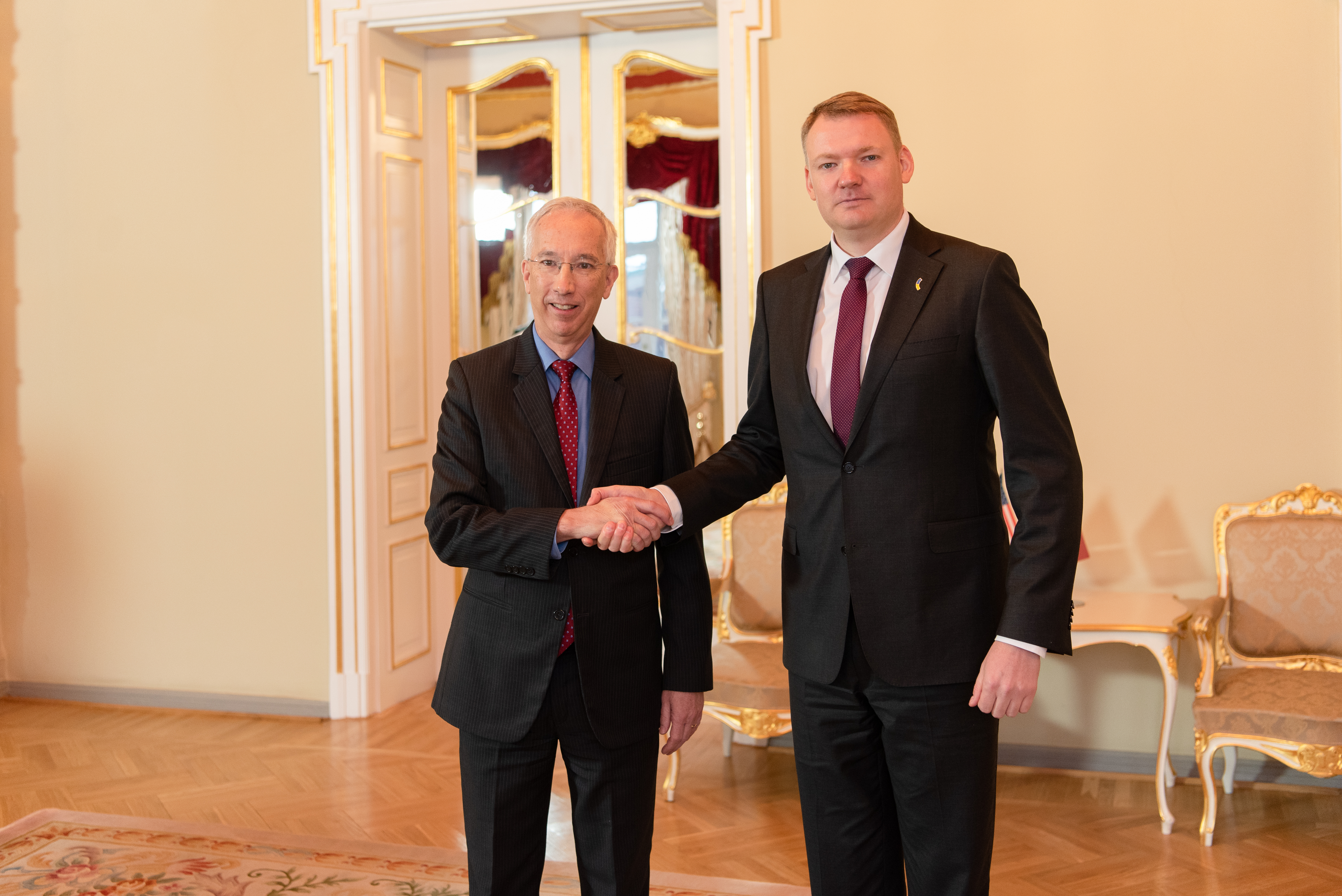 2023.gada 10.janvāris. Saeimas priekšsēdētājs Edvards Smiltēns tiekas ar Amerikas Savienoto Valstu ārkārtējo un pilnvaroto vēstnieku Latvijas Republikā Džonu Lesliju Kārvailu (John Leslie Carwile). Foto: Ieva Ābele, Saeima Izmantošanas noteikumi: saeima.lv/lv/autortiesibas