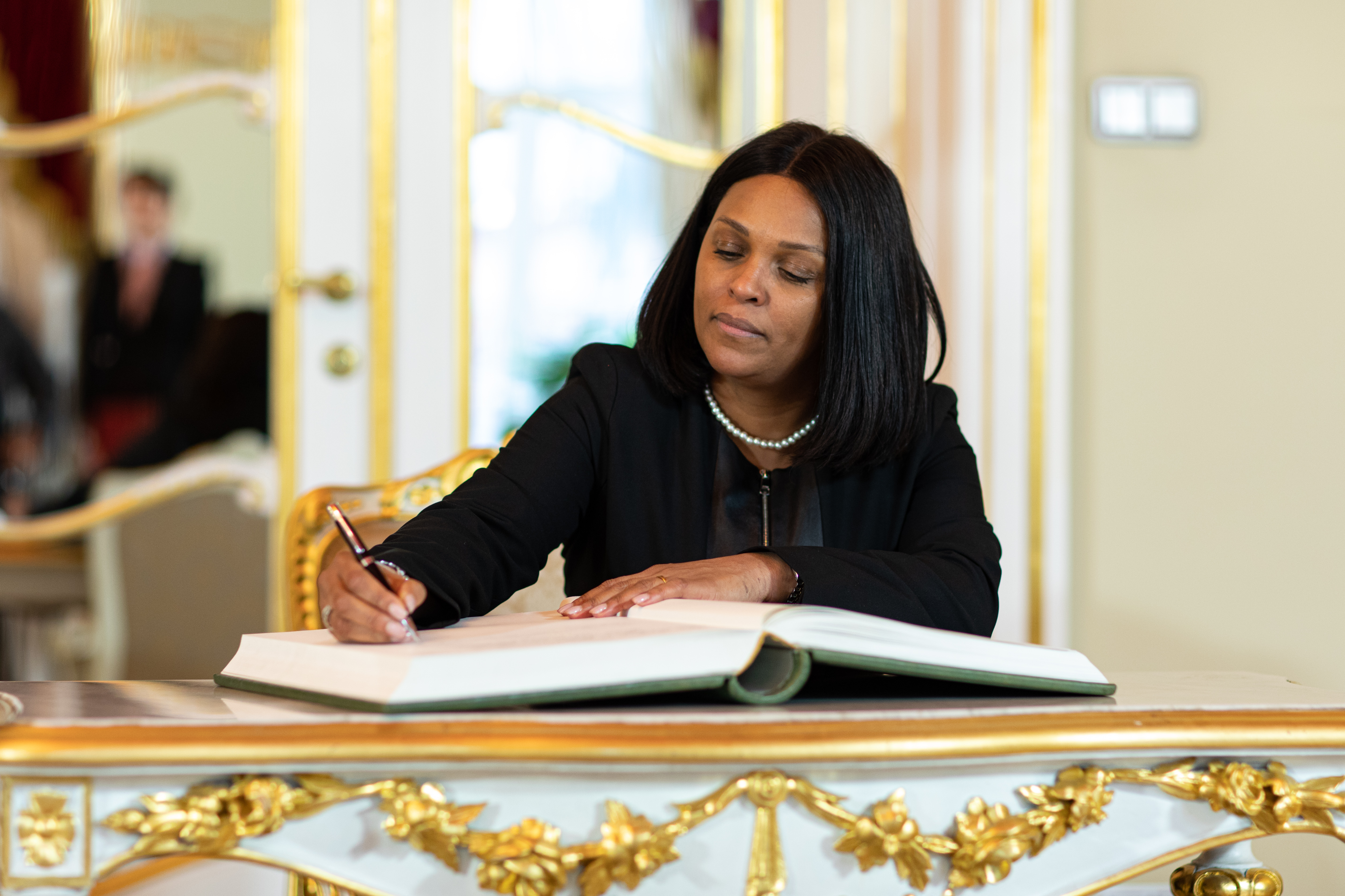 2023.gada 7.februāris. Saeimas priekšsēdētājs Edvards Smiltēns tiekas ar Gvinejas-Bisavas Republikas ārlietu ministri Suzi Karlu Barbozu (Suzi Carla Barbosa). Foto: Reinis Inkēns, Saeima Izmantošanas noteikumi: saeima.lv/lv/autortiesibas