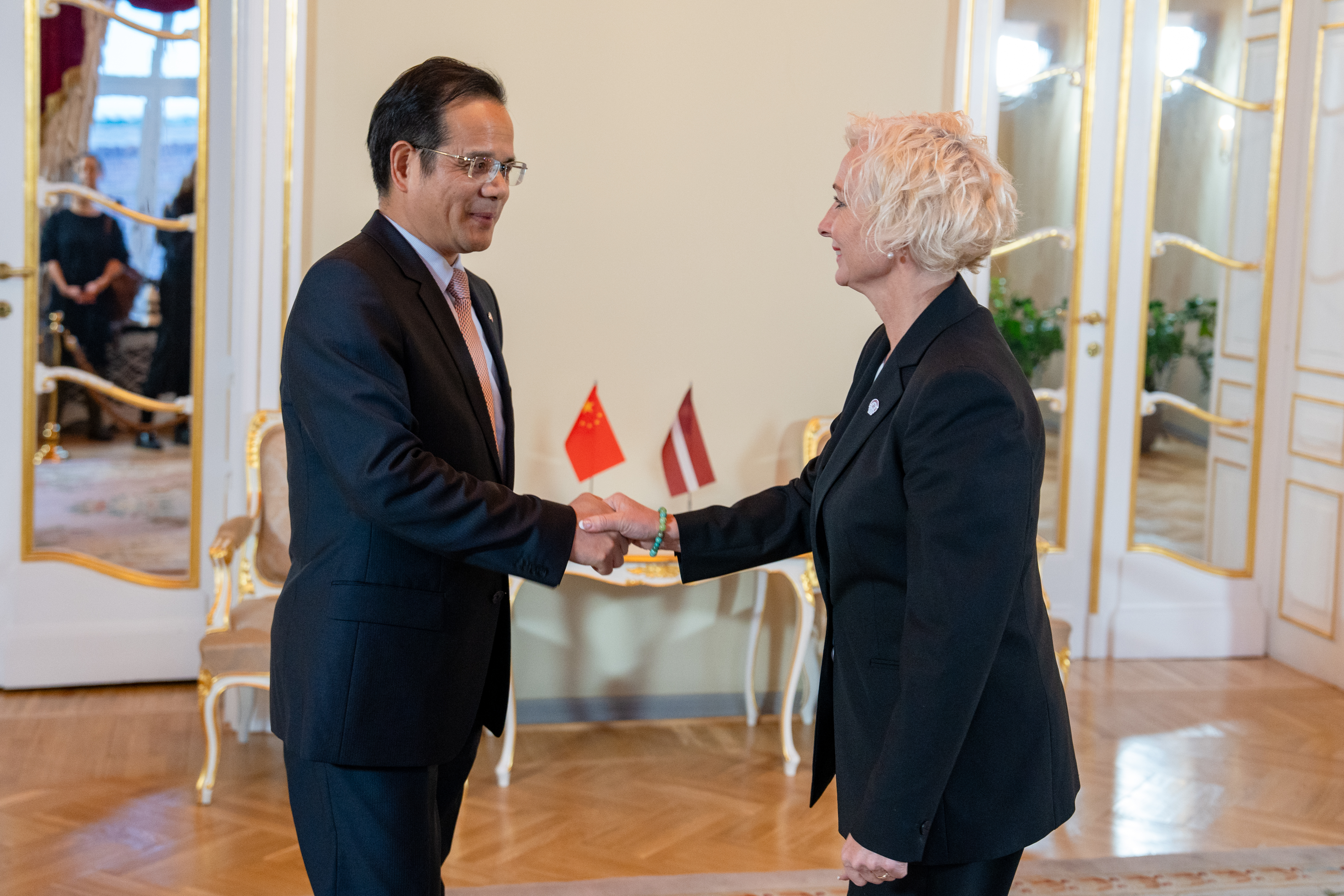 2023.gada 5.decembris. Saeimas priekšsēdētāja Daiga Mieriņa tiekas ar Ķīnas Tautas Republikas ārkārtējo un pilnvaroto vēstnieku Latvijas Republikā Tanu Sungeņu (Tang Songgen). Foto: Ieva Ābele, Saeima Izmantošanas noteikumi: saeima.lv/lv/autortiesibas