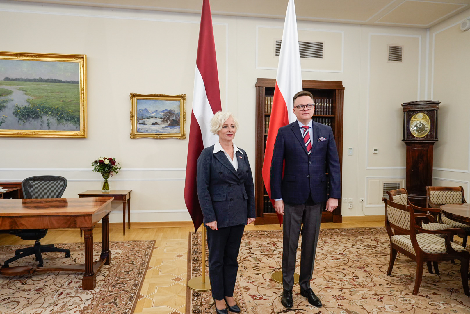2024.gada 15.janvāris. Saeimas priekšsēdētāja Daiga Mieriņa tiekas ar Polijas Sejma maršalu Šimonu Holovņu (Szymon Holownia). Foto: Juris Vīgulis, Saeima Izmantošanas noteikumi: saeima.lv/lv/autortiesibas
