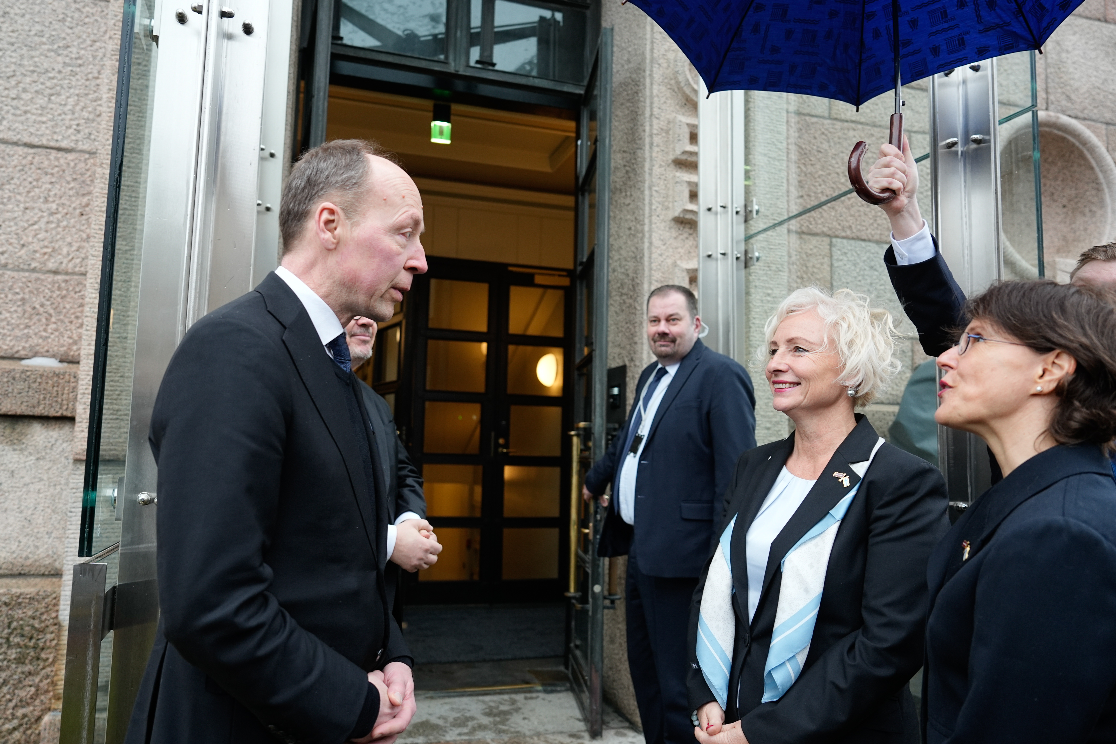 2024.gada 16.februāris. Saeimas priekšsēdētāja Daiga Mieriņa Somijas parlamentā tiekas ar tā priekšsēdētāju Jusi Hallaaho (Jussi Halla-Aho). Foto: Juris Vīgulis, Saeima Izmantošanas noteikumi: saeima.lv/lv/autortiesibas