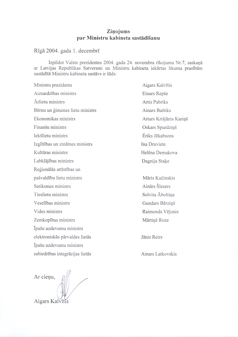 Pateicoties vairāk nekā desmit gadu ilgam, mērķtiecīgam darbam 2004.gadā ir sasniegti tie mērķi, kuriem bijis pakārtots daudzu valdību darbs: Latvijas valsts drošības vārdā esam kļuvuši NATO dalībvalsts un ar nolūku īsā laikā sasniegt pasaules attīstīto valstu labklājības līmeni esam kļuvuši par Eiropas Savienības pilntiesīgu locekli.