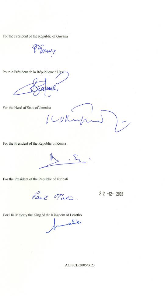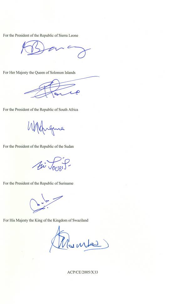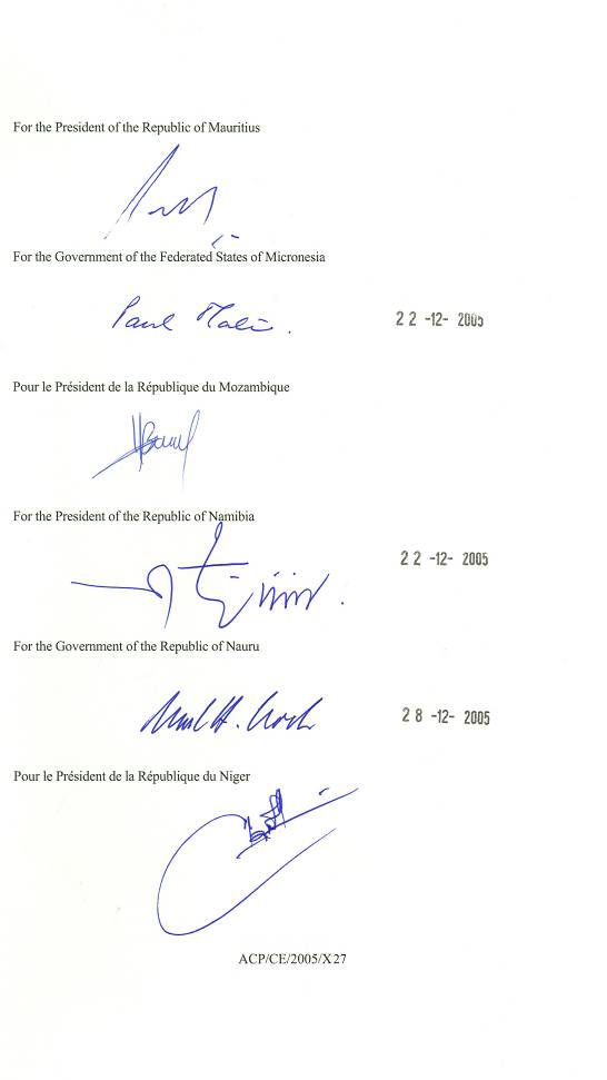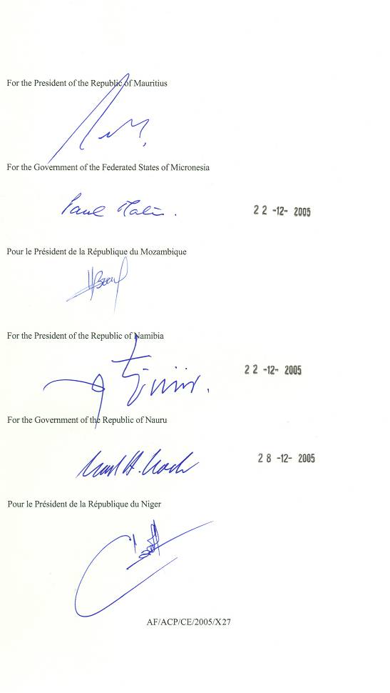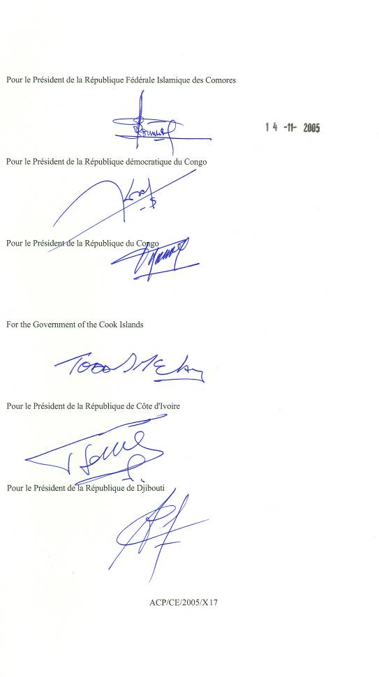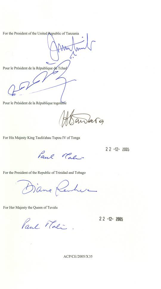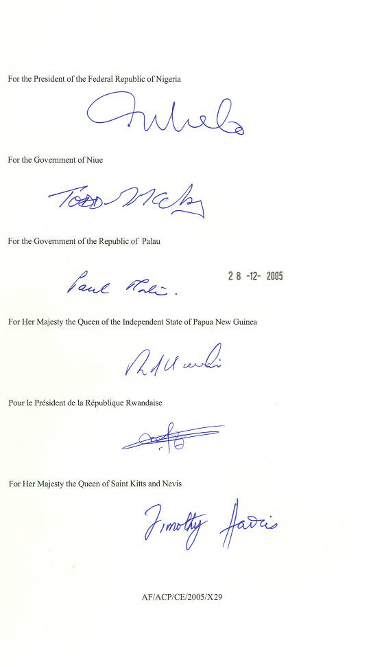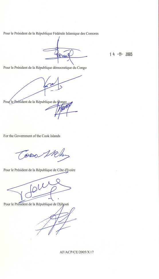 Pārskatītais Kotonū nolīgums tika parakstīts no 2005. gada 25. jūnija līdz 31. decembrim, Luksemburgā un Briselē. Kā līgumslēdzējpuses piedalījās ES dalībvalstis, Kopiena (tās vārdā nolīgumu paraksta persona, kuru tam pilnvaro Padome) un Āfrikas, Karību jūras reģiona un Klusā okeāna (ĀKK) valstis. Pēc parakstīšanās nolīgums tiek nodots ratifikācijai. Pārskatītais Kotonū nolīgums stāsies spēkā tā 93. panta kārtībā otrā mēneša pirmajā dienā, pēc tam, kad ES dalībvalstis, Kopiena un vismaz 2/3 ĀKK valstu iesniegs savus ratifikācijas instrumentus. Pārējām ĀKK valstīm savi ratifikācijas instrumenti jāiesniedz 12 mēnešu laikā pēc nolīguma stāšanās spēkā. Izņēmums ir tās ĀKK valstis, kurās uz ratifikācijas brīdi nepastāv leģitīmas valdības institūcijas. Tām tiek nodrošināta iespēja veikt ratifikācijas procedūru 12 mēnešu laikā pēc valdības institūciju atjaunošanas. Līgumslēdzējpuses pārskatīto Kotonū nolīgumu ratificē saskaņā ar attiecīgajām konstitucionālajām prasībām. Kopiena un tās dalībvalstis savus ratifikācijas instrumentus iesniedz ĀKK valstu Ģenerālsekretariātā, savukārt ĀKK valstis ratifikācijas instrumentus iesniedz ES Padomes Ģenerālsekretariātā. Pārskatītā
