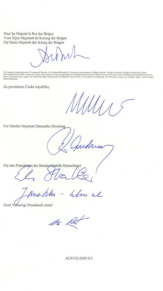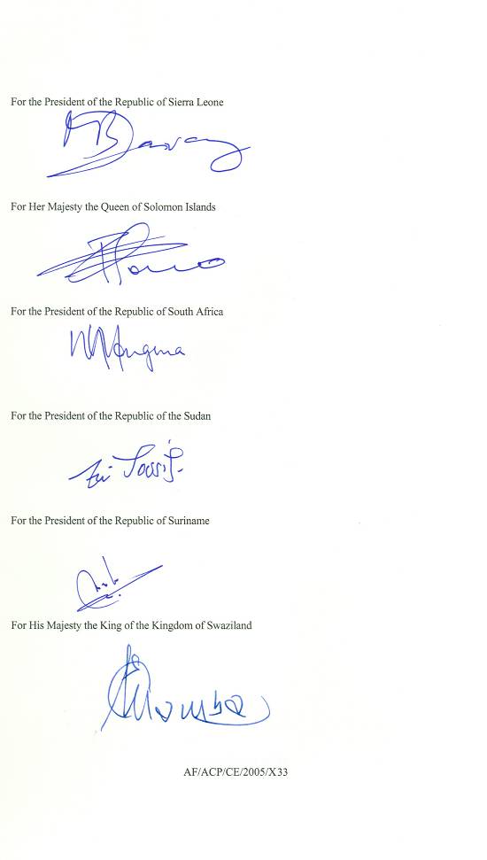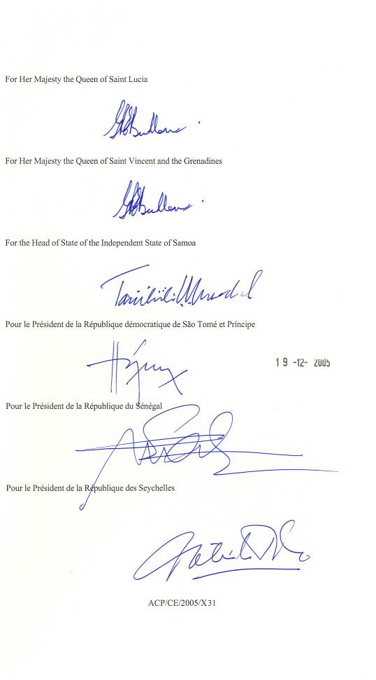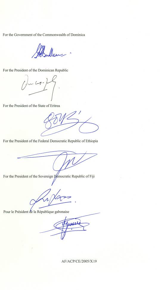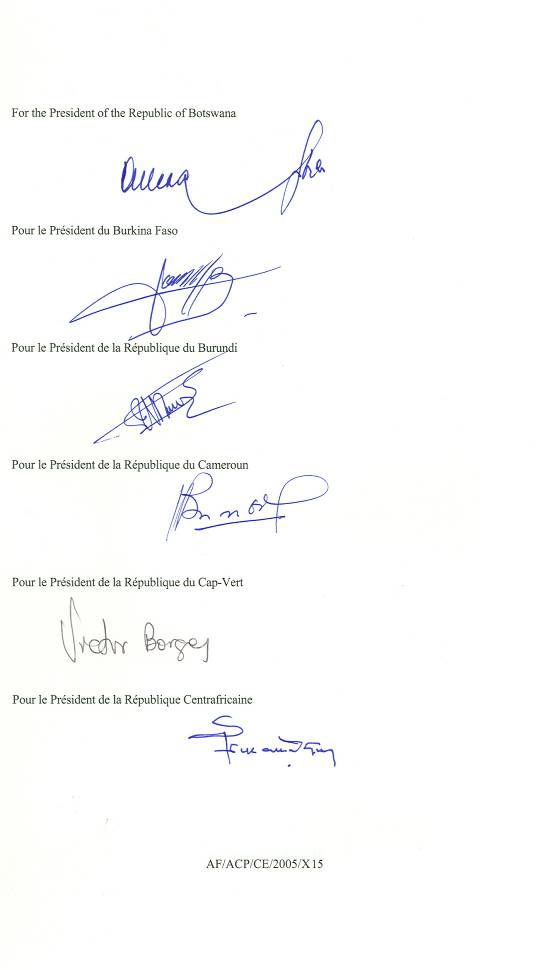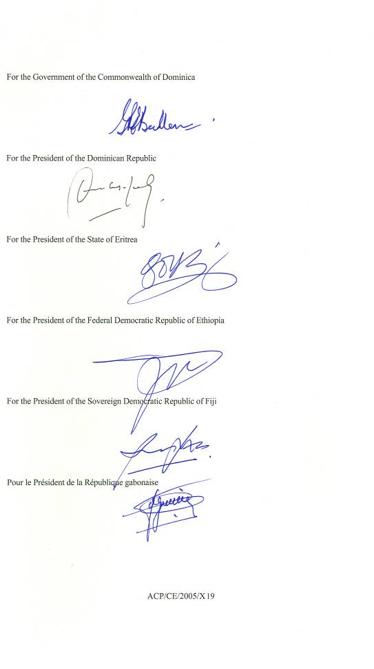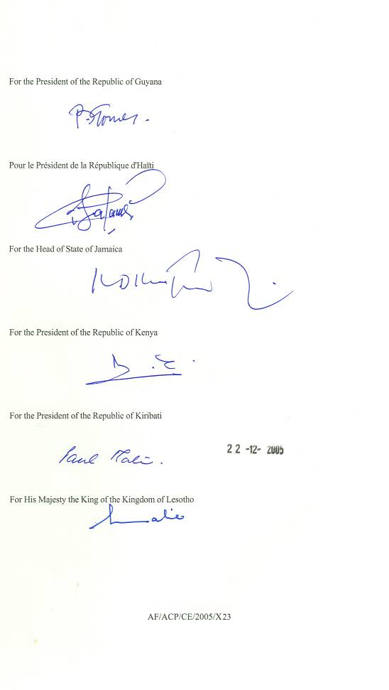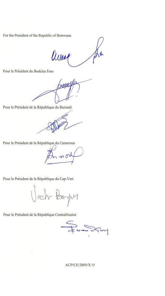 Pārskatītais Kotonū nolīgums tika parakstīts no 2005. gada 25. jūnija līdz 31. decembrim, Luksemburgā un Briselē. Kā līgumslēdzējpuses piedalījās ES dalībvalstis, Kopiena (tās vārdā nolīgumu paraksta persona, kuru tam pilnvaro Padome) un Āfrikas, Karību jūras reģiona un Klusā okeāna (ĀKK) valstis. Pēc parakstīšanās nolīgums tiek nodots ratifikācijai. Pārskatītais Kotonū nolīgums stāsies spēkā tā 93. panta kārtībā otrā mēneša pirmajā dienā, pēc tam, kad ES dalībvalstis, Kopiena un vismaz 2/3 ĀKK valstu iesniegs savus ratifikācijas instrumentus. Pārējām ĀKK valstīm savi ratifikācijas instrumenti jāiesniedz 12 mēnešu laikā pēc nolīguma stāšanās spēkā. Izņēmums ir tās ĀKK valstis, kurās uz ratifikācijas brīdi nepastāv leģitīmas valdības institūcijas. Tām tiek nodrošināta iespēja veikt ratifikācijas procedūru 12 mēnešu laikā pēc valdības institūciju atjaunošanas. Līgumslēdzējpuses pārskatīto Kotonū nolīgumu ratificē saskaņā ar attiecīgajām konstitucionālajām prasībām. Kopiena un tās dalībvalstis savus ratifikācijas instrumentus iesniedz ĀKK valstu Ģenerālsekretariātā, savukārt ĀKK valstis ratifikācijas instrumentus iesniedz ES Padomes Ģenerālsekretariātā. Pārskatītā