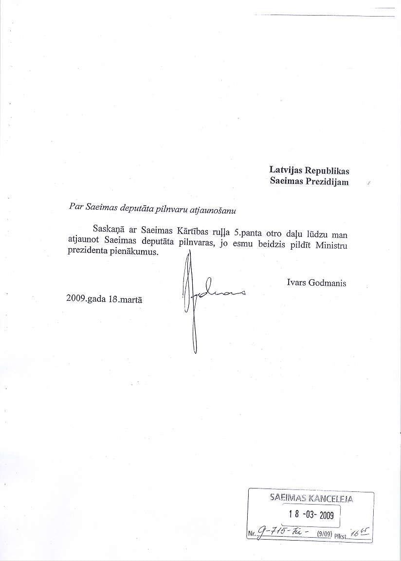 Godmaņa 2009.gada 18.marta iesniegumu par deputāta mandāta atjaunošanu, kuru