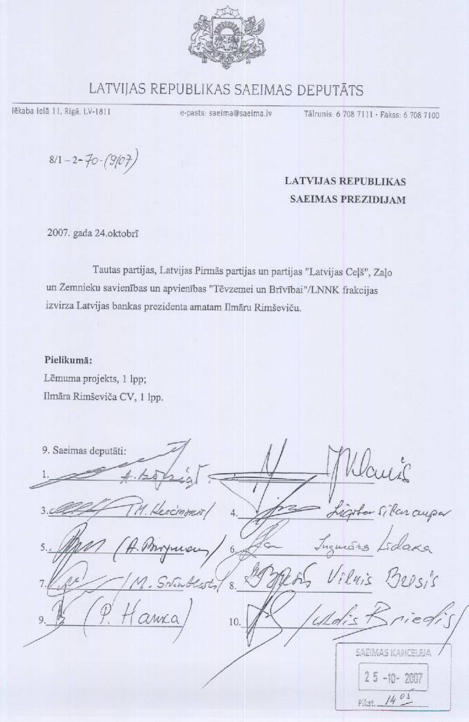 Ilmāra Rimšēviča ievēlēšanu par Latvijas Bankas prezidentu sadaļā II. Amatpersonu ievēlēšana,