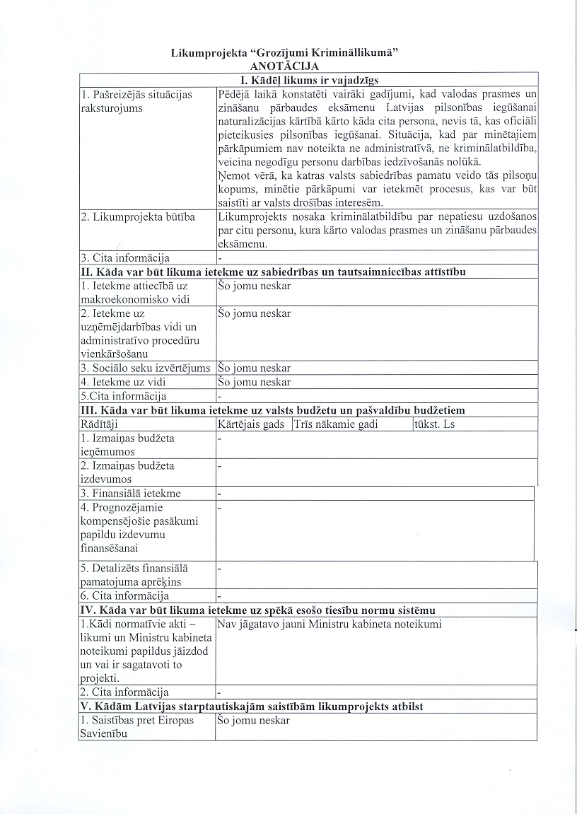 (1) Par nepatiesu uzdošanos par citu personu, kura kārto valodas prasmes un zināšanu pārbaudes eksāmenu nolūkā iegūt citai personai Latvijas pilsonību naturalizācijas kārtībā, -