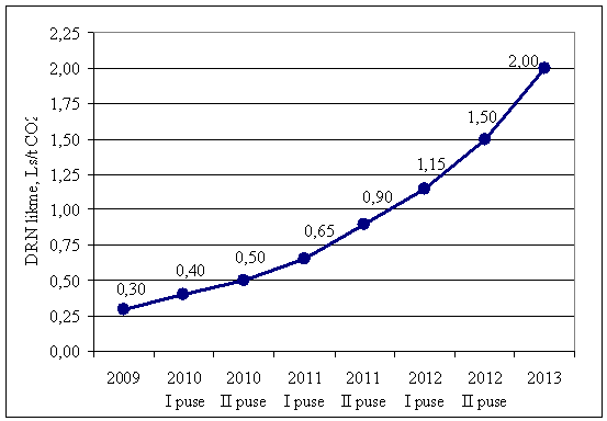 Šīs papildu izmaksas ir iekļaujamas siltumenerģijas un elektroenerģijas tarifos, nemazinot šo uzņēmumu konkurētspēju, t.sk. attiecībā pret ES ETS dalībniekiem, kuri tarifos iekļaus līdzvērtīgas ar emisijas kvotu iegādi saistītās izmaksas. Nodokļa likme līdz 2 Ls/t CO2 pieaugs pakāpeniski līdz 2013.gadam (skat. Attēlu Nr.2), kas neradīs straujas izmaiņas siltumenerģijas un elektroenerģijas tarifos.