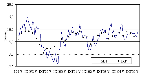 Saskaņā ar Finanšu ministrijas novērtējumu, Makroekonomisko rādītāju saliktais indekss (MSI)[2] 2005. gada pirmajā pusē, salīdzinājumā ar pērnā gada attiecīgo periodu, salīdzināmajās cenās pieauga par 8,2%, tai skaitā I ceturksnī par 8,1%, bet II ceturksnī par 8,4 procentiem. Š.g. I ceturksnī MSI pieaugumu galvenokārt noteica preču eksporta pieaugums, kā arī mazumtirdzniecības apgrozījuma palielinājums. Par ekonomiskās aktivitātes pieaugumu liecina arī iekšzemes naudas piedāvājuma M2D palielinājums. Savukārt indeksa pieaugumu š.g. I ceturksnī ierobežoja rūpniecības produkcijas izlaides un ostās pārkrauto kravu apjoma samazinājums. Š.g. II ceturksnī MSI pieaugumu visvairāk veicināja eksporta kāpums un pieaugums transporta nozarē, jo palielinājās gan ostās pārkrauto kravu apjoms, gan kravu pārvadājumi pa dzelzceļu.