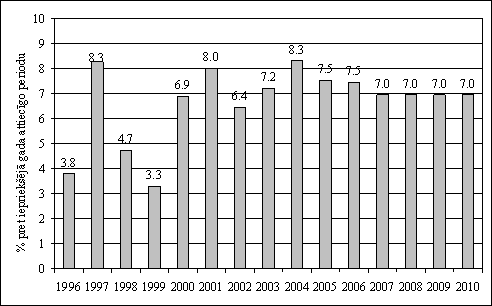 Pēc ilga zemas inflācijas perioda 2003. gada beigās iezīmējās straujāka cenu pieauguma tendence, kas būtiski pastiprinājās 2004. gada laikā. 2004. gada augustā 12 mēnešu inflācija sasniedza 7,8% līmeni. Pēc tam bija vērojama inflācijas līmeņa pakāpeniska samazināšanās un gada vidējais patēriņa cenu pieaugums pērn bija 6,2%.