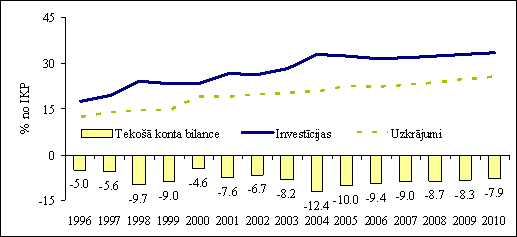 Maksājumu bilances tekošā konta deficīts 2004. gadā veidoja 12,4% no IKP. Tekošā konta negatīva saldo pieaugumu, salīdzinot ar iepriekšējiem gadiem, noteica preču un ienākumu negatīvā saldo attiecības pret IKP pieaugums un pakalpojumu pozitīvā saldo kritums, savukārt kārtējo pārvedumu pozitīvais saldo nedaudz palielinājās. Līdzīgi kā citus gadus tekošā konta deficītu sedza ārvalstu tiešās investīcijas un cits ilgtermiņa kapitāls. Latvijā veikto tiešo investīciju apjoms 2004. gadā bija divas reizes lielāks salīdzinājumā ar 2003. gadu.