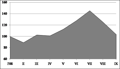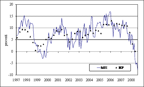 Saskaņā ar Finanšu ministrijas novērtējumu, Makroekonomisko rādītāju saliktais indekss (MSI)[3] 2008. gada 8 mēnešos, salīdzinājumā ar pērnā gada attiecīgo periodu, salīdzināmās cenās samazinājās par 0,9 procentiem. Š.g. 8 mēnešos MSI pozitīvi ietekmēja iedzīvotāju ienākumu pieaugums. Savukārt indeksa samazinājumu noteica zemā rūpnieciskās produkcijas izlaide, negatīvais mazumtirdzniecības pieauguma apgrozījums un mazāks skaidrās naudas daudzums apgrozībā salīdzinājumā ar atbilstošo periodu 2007. gadā.