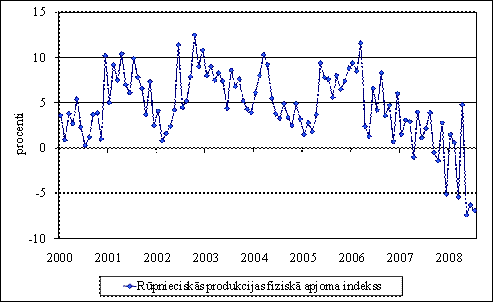 2008. gada 7 mēnešos, salīdzinot ar iepriekšējā gada attiecīgo periodu, sezonāli izlīdzinātā rūpniecības produkcijas izlaide samazinājās par 3,1%, Tai skaitā ieguves rūpniecības nozarē apjomi palielinājās par 4,2%, bet samazinājums bija novērojams apstrādes rūpniecībā par 5,2% un elektroenerģijas un gāzes apgādē par 1,1 procentu.