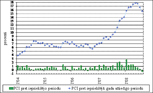 Nozīmīgi pieauga arī pārtikas cenas, kas 2008. gada pirmajos 8 mēnešos palielinājās par 8,5 procentiem. Cenas pieauga arī tādiem nozīmīgiem pārtikas produktiem kā kartupeļiem par 26,4% eļļām un taukiem par 23,0%, labības produktiem par 19,6%, augļiem par 10,1%, gaļai par 12,8%, pienam un piena produktiem par 8,6%, olām par 8,7 procentiem. Vislielākais cenu kritums bija vērojams tādiem sezonāliem produktiem kā dārzeņi, kas kļuva lētāki par 14,7 procentiem. Degvielas cenas 2008. gada pirmajos 8 mēnešos pieauga par 14,2 procentiem. gada sākumā degvielai atbilstoši ES prasībām tika palielināta arī akcīzes likme, kas degvielu sadārdzināja vidēji par 0,02 Ls/litrā. Dažām precēm tika novērots arī cenu kritums, piemēram, apģērbam un apaviem par 8,4%, telefonu iekārtām par 8,6%, audio, video, foto un datu apstrādes iekārtām par 11,0 procentiem.