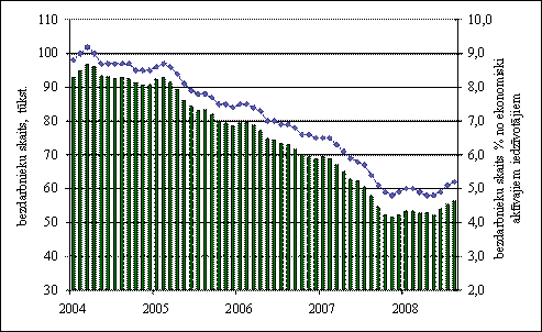 2008. gada II ceturkšņa beigās reģistrētā bezdarba līmenis, salīdzinot ar 2007. gada II ceturkšņa bezdarba līmeni ir samazinājies par 0,9 procentpunktiem, un bija 4,9 procenti. Kopējais valstī reģistrēto bezdarbnieku skaits 2008. gada II ceturksnī bija 54,0 tūkst. cilvēku, salīdzinot ar iepriekšējā gada atbilstošo periodu, reģistrēto bezdarbnieku skaits samazinājies par 8,3 tūkst. cilvēku. Vasaras periodā, sekojot lēnākai ekonomikas izaugsmei, bezdarba rādītāji nedaudz pieauga, un augustā bezdarba līmenis bija 5,2 procenti.