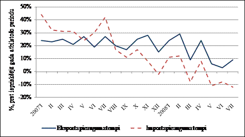 Šogad iezīmējās ekonomiskās aktivitātes kritums vairumā pasaules tautsaimniecību, tajā skaitā Eiropas Savienībā un Krievijas Federācijā, kas ir Latvijas galvenie tirdzniecības partneri. Vairumā ES valstu šogad ir novērojams inflācijas līmeņa pieaugums un IKP pieauguma tempu samazinājums, ko ir veicinājis būvniecības nozaru samazinājums un krīze pasaules finanšu tirgos. Rezultātā ir krities valstu iekšējais pieprasījumu un tādējādi arī pieprasījums pēc importa, kas var negatīvi atspoguļoties uz Latvijas ārējās tirdzniecības bilanci. Īpaši to var ietekmēt ekonomikas pasliktināšanās Igaunijā un Lietuvā, kas kopumā veido aptuveni 25% no Latvijas ārējās tirdzniecības apgrozījuma.