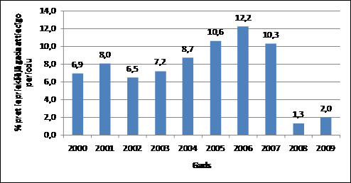 2006. gadā, kad deficīts pieauga par 10 procentpunktiem un sasniedza 22,5%