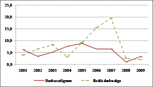 Vidējā bruto darba alga tautsaimniecībā 2006. gadā pieauga par 23%, bet 2007. gadā par 31,5 procentiem. 2008. gada pirmajā pusē darba samaksas kāpums turpinājās vidēji par 25,6 procentiem. Šāds pieaugums pārsniedz reālās algas un produktivitātes pieauguma sakarību, nosakot Latvijas tautsaimniecības ārējās konkurētspējas samazināšanos. Sākot ar 2009. gadu, ir sagaidāms, ka darba ražīguma palielinājums pārsniegs darba samaksas pieaugumu, ko noteiks būtiski saspringtāka darba tirgus situācija. Tā kā nākošajos gados ir gaidāma inflācijas līmeņa samazināšanās, un arī produktivitātes palielinājums būs zemāks nekā iepriekšējos gados, darba samaksas pieauguma tempi faktiskajās cenās samazināsies līdz 11,9% 2009. gadā.