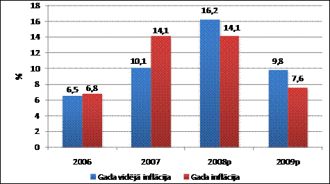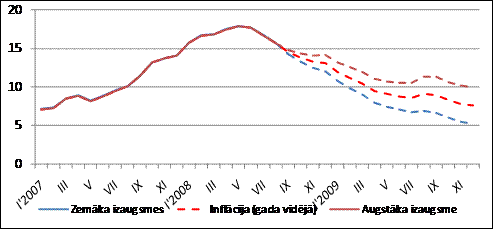 Nesenās tendences norāda, ka inflācijas kāpums Latvijā 2008. gada jūnijā sasniedzis maksimumu un nākotnē samazināsies gan algu cenu spirāles efekta mazināšanās dēļ, gan arī ekonomikas strukturālo izmaiņu ietekmē. Tādējādi Finanšu ministrijas izstrādātais scenārijs paredz, ka 2008. gadā vidēja inflācija vēl sasniegs 16,2%, bet 2009. gadā samazināsies līdz 9,8 procentiem.