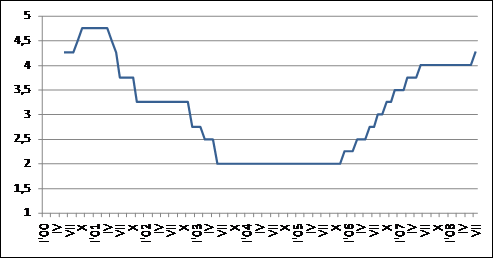 1.17. att. Eiro bāzes likmes vēsturiskās izmaiņas, % (Eiropas Centrālās bankas dati).