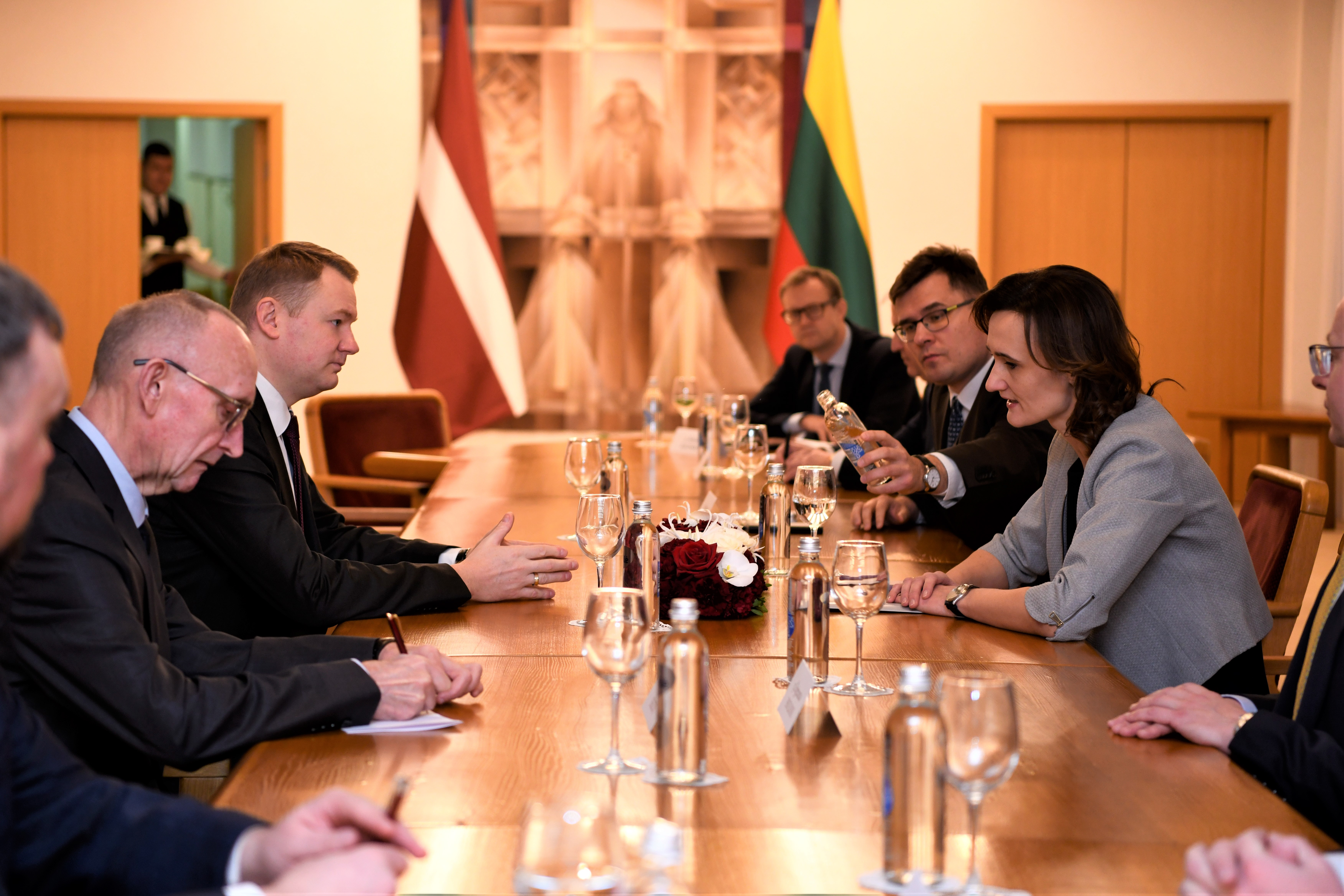 2022. gada 29. novembris Saeimas priekšsēdētājs Edvards Smiltēns tiekas ar Lietuvas parlamenta priekšsēdētāju Viktoriju Čmilīti-Nilsenu (Viktorija Čmilytė-Nielsen). Foto: Juris Vīgulis, Saeima Izmantošanas noteikumi: saeima.lv/lv/autortiesibas