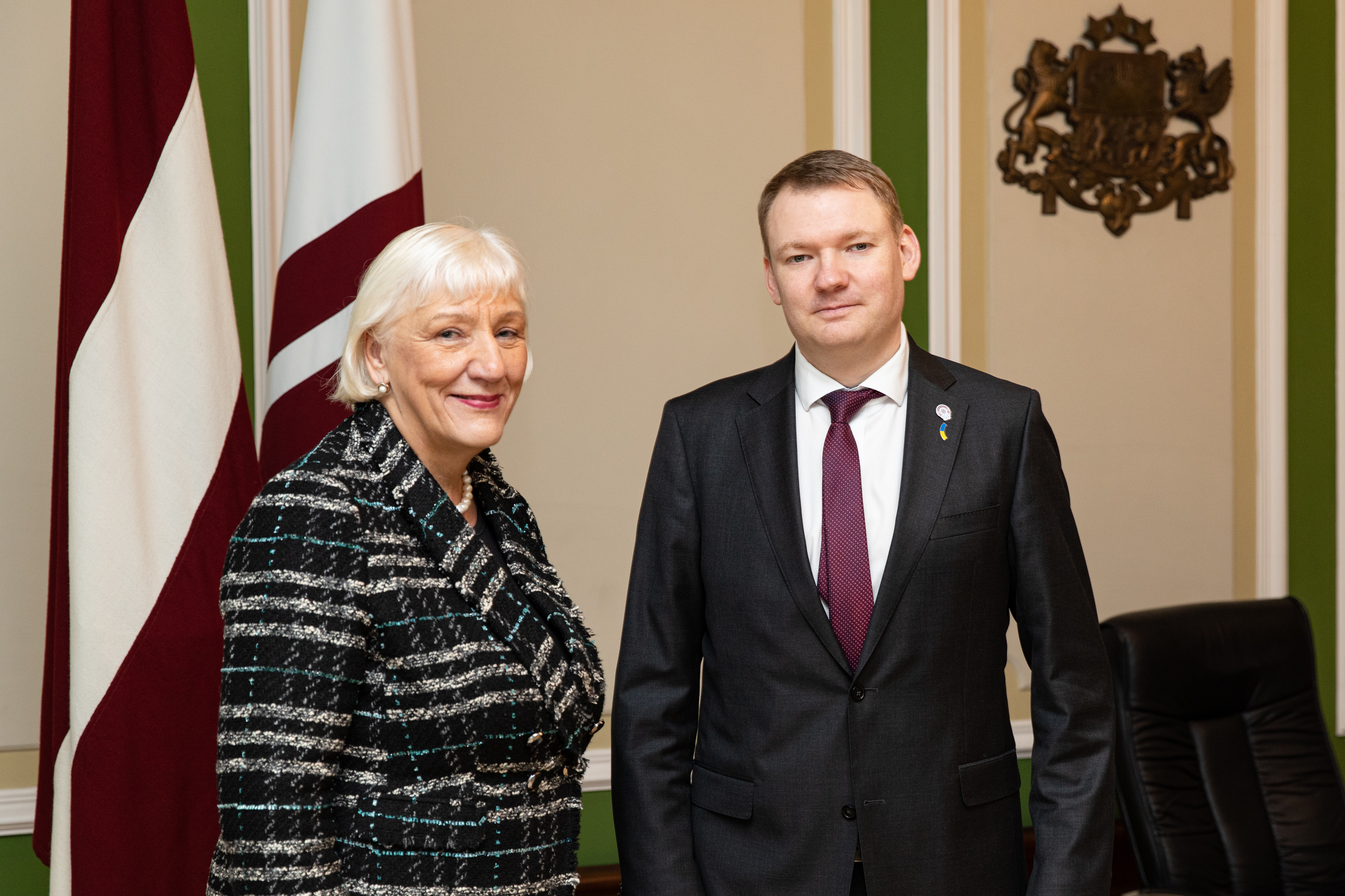 2022.gada 21.decembris. Saeimas priekšsēdētājs Edvards Smiltēns tiekas ar 4.maija Deklarācijas kluba prezidenti Veltu Čebotarenoku. Foto: Reinis Inkēns, Saeima Izmantošanas noteikumi: saeima.lv/lv/autortiesibas