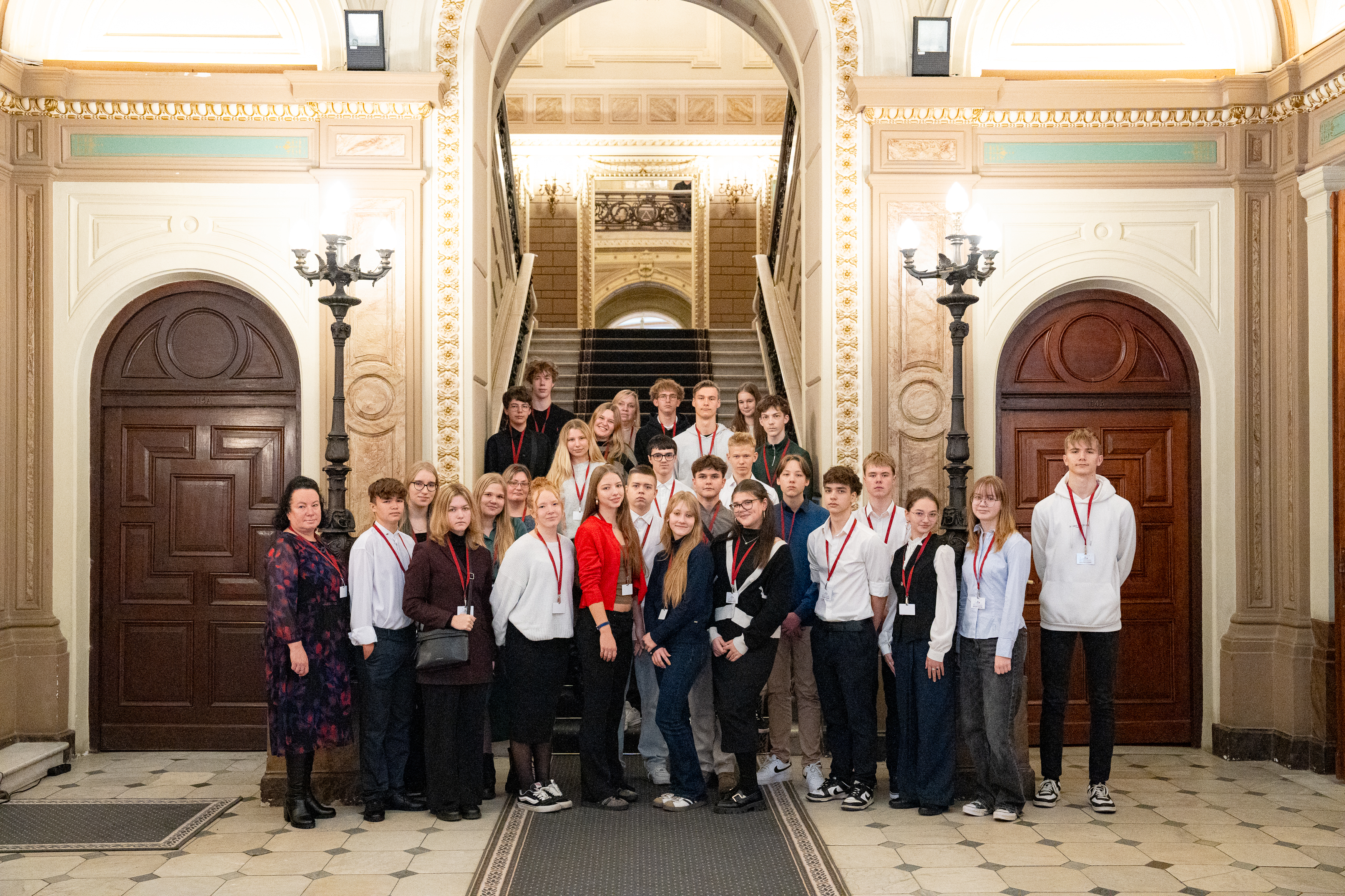 2025. gada 30. oktobris. Rīgas 84.vidusskolas 9.a klases skolēni apmeklē Saeimu skolu programmas "Iepazīsti Saeimu" ietvaros.. Foto: Ieva Ābele, Saeima Izmantošanas noteikumi: saeima.lv/lv/autortiesibas