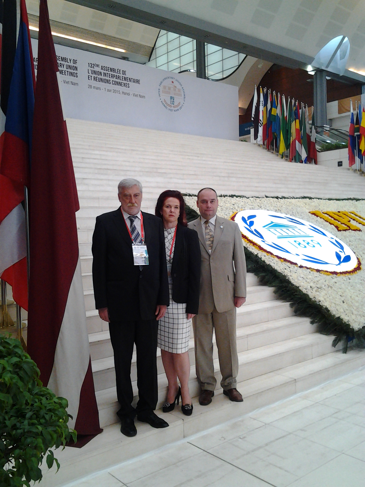 2015.gada 30.marts. Starpparlamentu Savienības Latvijas nacionālās grupas vadītājs Gundars Daudze un grupas locekļi Solvita Āboltiņa un Sergejs Mirskis piedalās Starpparlamentu Savienības132.asamblejā Foto: Sandra Paura, Saeimas Kanceleja Izmantošanas noteikumi: saeima.lv/lv/autortiesibas
