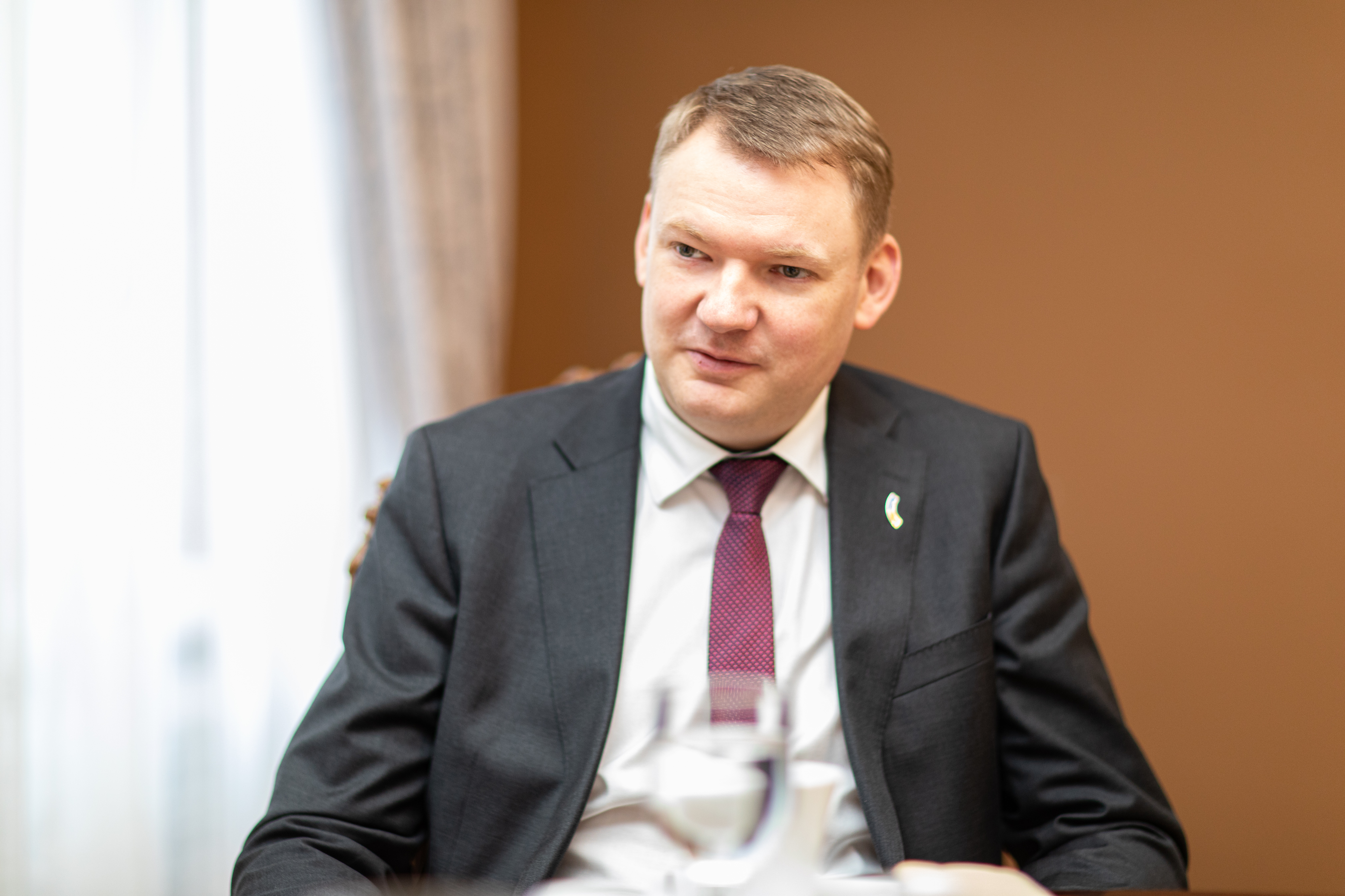 2023.gada 7.februāris. Saeimas priekšsēdētājs Edvards Smiltēns tiekas ar Šveices Konfederācijas ārkārtējo un pilnvaroto vēstnieku Latvijas Republikā Martēnu Mišlē (Martin Michelet). Foto: Reinis Inkēns, Saeima Izmantošanas noteikumi: saeima.lv/lv/autortiesibas