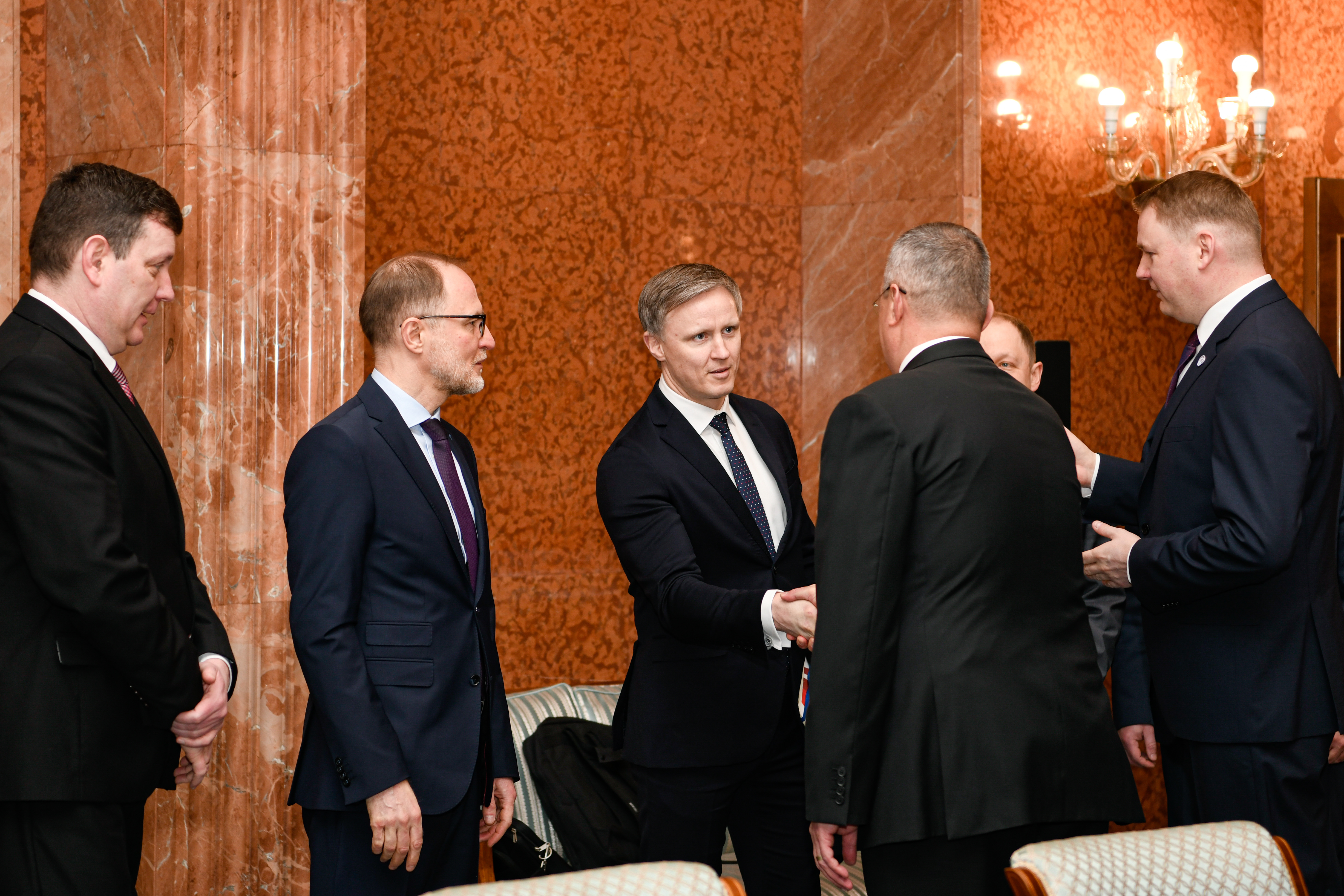 2023.gada 20.marts. Saeimas priekšsēdētājs Edvards Smiltēns un viņa vadītā delegācija Bukarestē tiekas ar Rumānijas Ministru prezidentu Nikolaju Čiuču (Nicolae Ciucă). Foto: Juris Vīgulis, Saeima Izmantošanas noteikumi: saeima.lv/lv/autortiesibas
