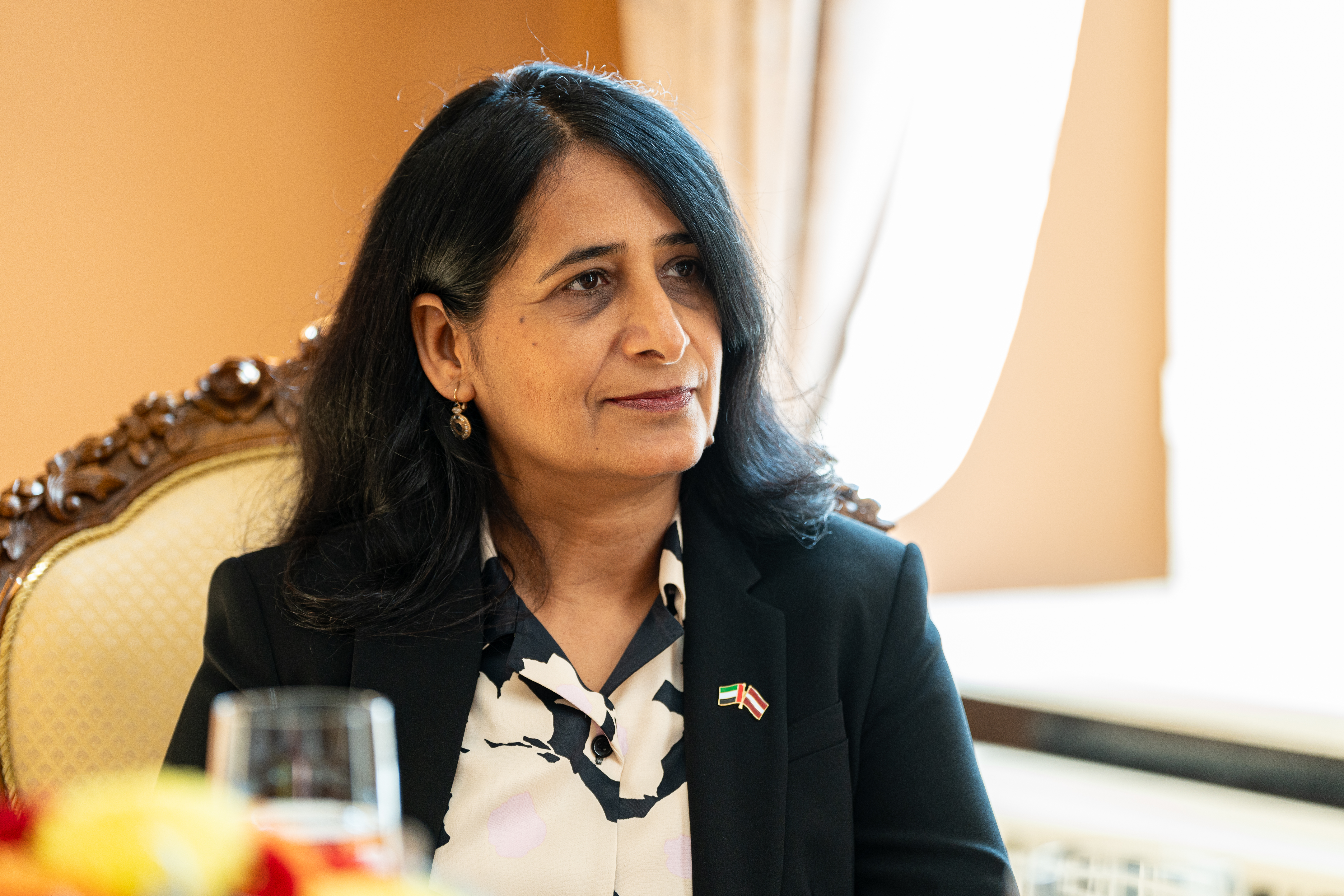 2024.gada 17.septembris. Saeimas priekšsēdētāja Daiga Mieriņa tiekas ar Apvienoto Arābu Emirātu ārkārtējo un pilnvaroto vēstnieci Latvijas Republikā Nūru Muhammadu Džumu (Noora Mohammed A. Juma). Foto: Reinis Inkēns, Saeima Izmantošanas noteikumi: saeima.lv/lv/autortiesibas