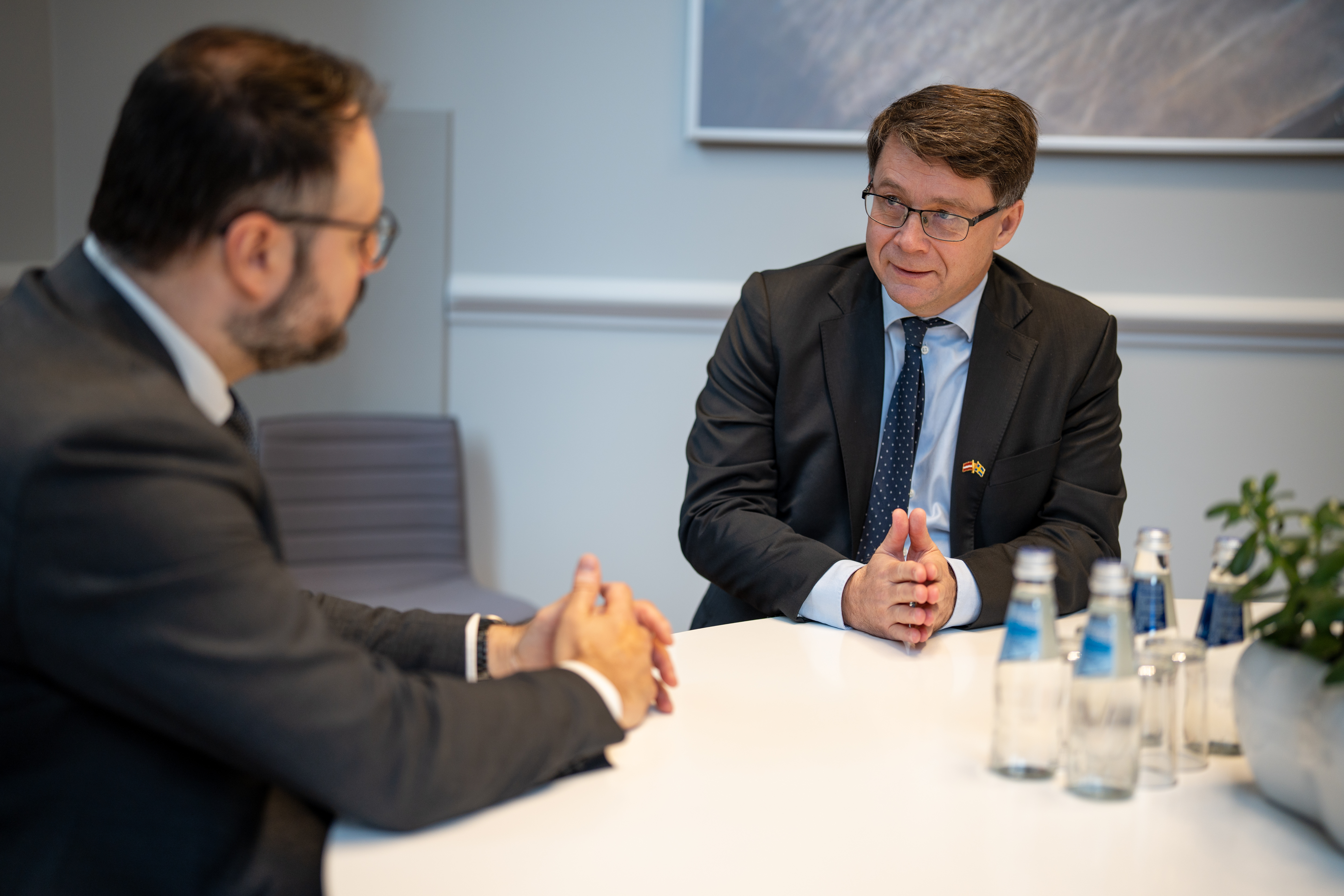 2025. gada 4.novembris. Saeimas Tautsaimniecības, agrārās, vides un reģionālās politikas komisijas priekšsēdētājs Kaspars Briškens tiekas ar Zviedrijas Karalistes ārkārtējo un pilnvaroto vēstnieku Danielu Ulsonu (Daniel Olsson). Foto: Ieva Ābele, Saeima Izmantošanas noteikumi: saeima.lv/lv/autortiesibas