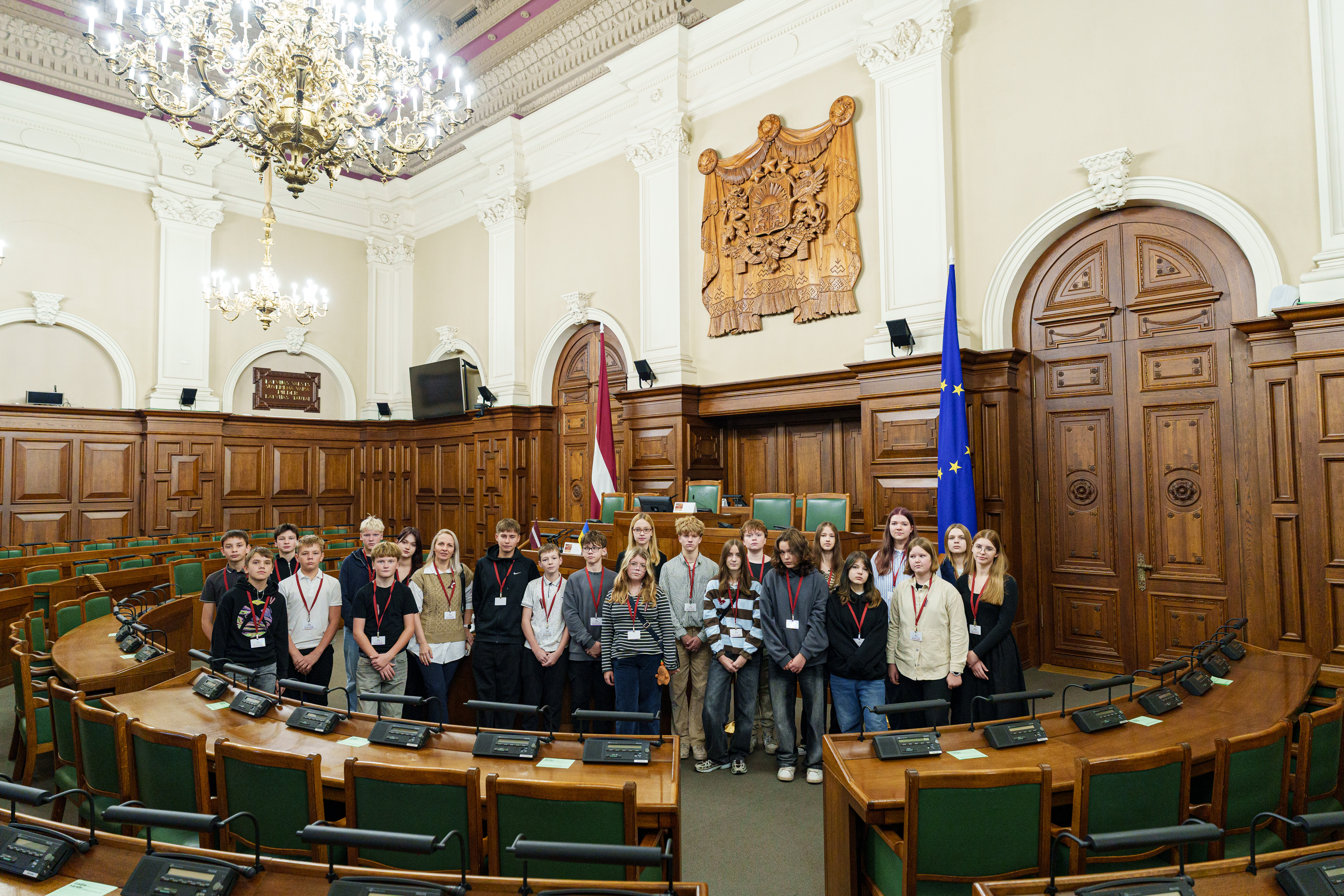 2025. gada 12. novembris Salaspils 1.vidusskolas 7.a klases skolēni apmeklē Saeimu skolu programmas "Iepazīsti Saeimu" ietvaros. Foto: Reinis Inkēns, Saeima Izmantošanas noteikumi: saeima.lv/lv/autortiesibas